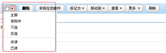 如果您想对当前页面中的少数邮件进行操作,可直接在邮件前面打勾选中;如果您想全部选中本页的邮件,进入该文件夹后可直接点击功能栏最左侧的“复选框”按钮,此时,该按钮相当于全选;如果希望对当前页面中的多数文件进行操作,可点开右侧的下拉三角,进行更多操作的选择。